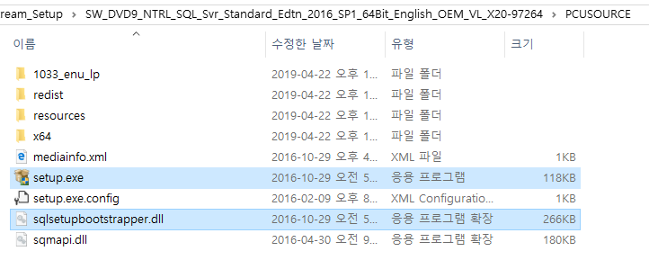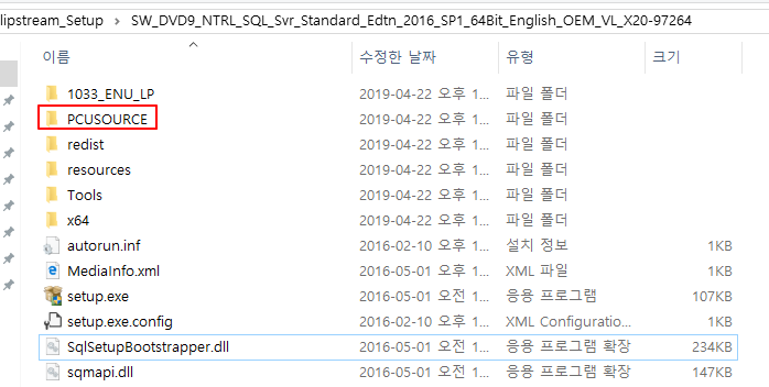 3) PCUSOURCE 폴더 안에 들어가서 setup.exe, SqlSetupBootstrapper.dll과 sqmapi.dll을 복사하고 RTM 설치 미디어 폴더 안에 덮어쓰기를 합니다.