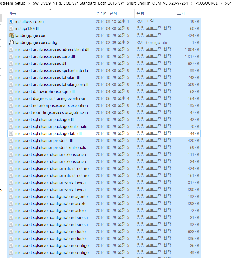 4) PCUSOURCE 폴더 안에 있는 x64 폴더를 들어가서 Microsoft.SQL.Chainer.PackageData.dll 파일만을 제외하고 모든 파일들을 선택한 다음 '복사'합니다(하위 폴더 제외).